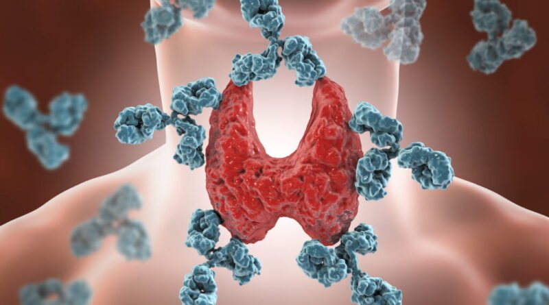 Tiroidite autoimmune, malattia di Hashimoto. Illustrazione 3D che mostra gli anticorpi che attaccano la ghiandola tiroidea